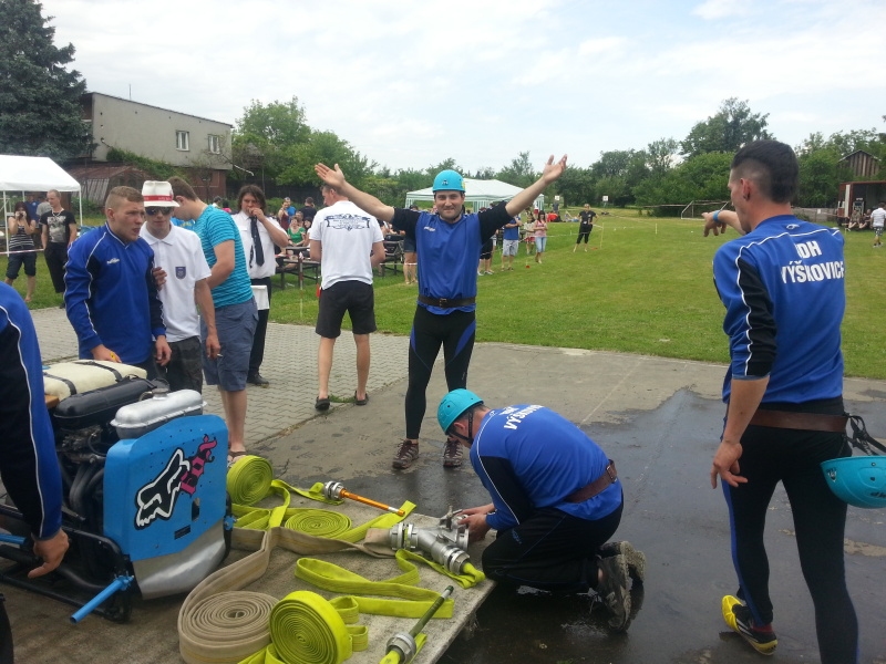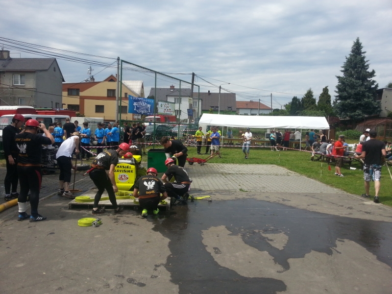 Samotná soutěž byla zahájena 10:20 min. Jako první se na startovní čáru postavilo družstvo žen z Jístebníku a svým hodně povedených časem 19.065s nastavili pěknou laťku. Jako druhé v pořadí se nám předvedli obhájci prvního místa z minulého roku kategorie mužů a to domácí Výškovice. Časomíra se zastavila na výborným čase 14.591s (což bylo o necelých 0.4s lepší čas oproti minulému roku) a vypadalo to, že i letos budou Výškovice bojovat o umístění na "bedně". Následující družstva jako Janovice, Hukovice a Slatina se nám předvedla se solidními časy okolo 16s. Jako osmé v pořadí se nám předvedly holky ze sousedního Tísku a jejich povedený pokus s časem 18.441s je zařadil na průběžné první místo kategorie žen. V pořadí další družstvo žen z Hukovic svým časem 18.695s jen těsně neohrozilo Tísek a jejich první místo. Velkým favoritem soutěže a adepty na první místa celkového umístění byla družstva z Prchalova - a nezklamala. Tým A dokončil svůj pokus v čase 14.527s a tým B 14.582 (ovšem tento manšaft sestřikl nejrychleji terč v celé soutěži v čase 13.840s). Mezi těmito pokusy se nám jěště předvedli borci z Tísku, kteří i přes mírné indispozice z předešlých oslav výročí svého založení dokončili svůj útok v čase 14.527s. Tento čas je zařadil na druhé místo a toto tim vydrželo až do konce soutěže. Týmy, které jěště dosáhly na 14kové časy byly Lesní Albrechtice a Kujavy. Družstvo, které před koncem soutěže mohlo výrazně zasáhnout do výsledkové listiny žen bylo ze Staré Vsi nad Ondřejnicí. Bohužel velký prostřik na pravém terči (5.5s) jim zhatil veškeré šance na pěkné umístení a holky si právem odvezly alespoň prémii za nejrychleji trefený terč v soutěži v kategorii žen (17.119s). Jako poslední družstvo, i když bohužel mimo soutěž (díky pravidlům NJ ligy ohledně půjčovaní členů), se předvedlo domácí družstvo mužů Výškovice B. I přes "několikaleté netrénování" se jim povedl čas okolo 16s., což jim dodalo sílu a sebevědomí na další možné letošní pokračování v požárních útocích.
