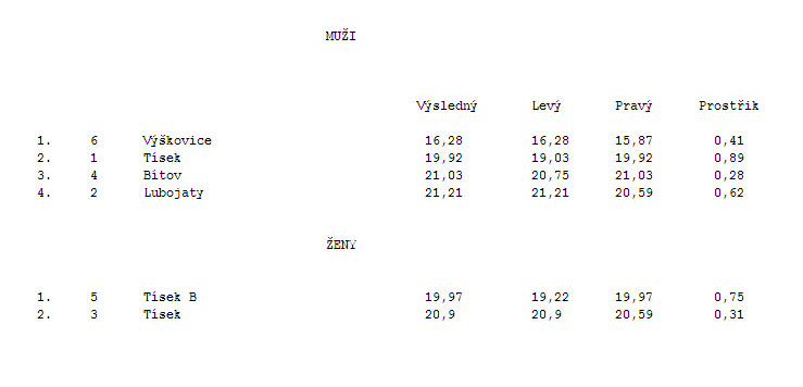 Soutěž byla vyhlášena na dvě kola a jako první se na start postavilo družstvo mužů z Tísku. Výsledný čas přes 22s. určitě potěšení klukům nepřinesl, ovšem pro každého byl v záloze ještě pokus v kole druhém.