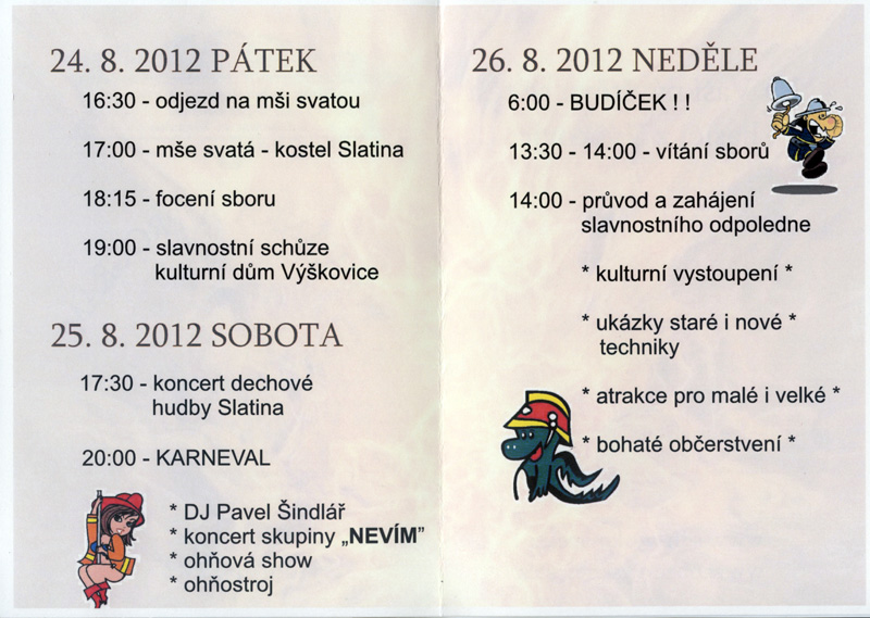 SDH Výškovice oslaví v srpnu 120. výročí založení sboru. Oslavy jsou naplánovány na poslední srpnový víkend, tj. 24. - 26.8.2012. Přípravy jsou v plném proudu a určitě se máme na co těšit. Jen tomu počasí nedokážeme zatím ještě poručit, tak snad k nám bude nakloněno.
